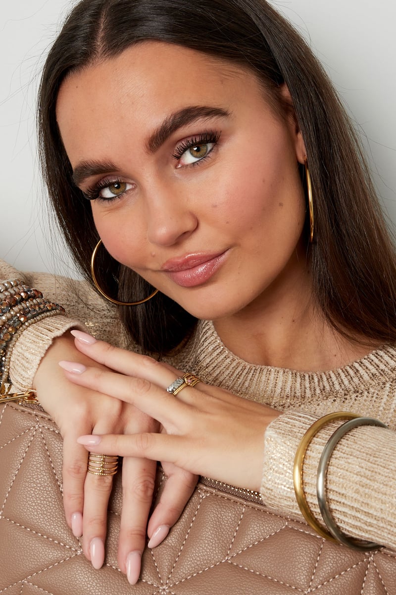 Met een dikte van 0,5 cm en een diameter van 6,5 cm, is deze armband ideaal om te combineren met andere sieraden. Verkrijgbaar in zowel zilver als goud, voegt het een speelse touch toe aan je dagelijkse look.