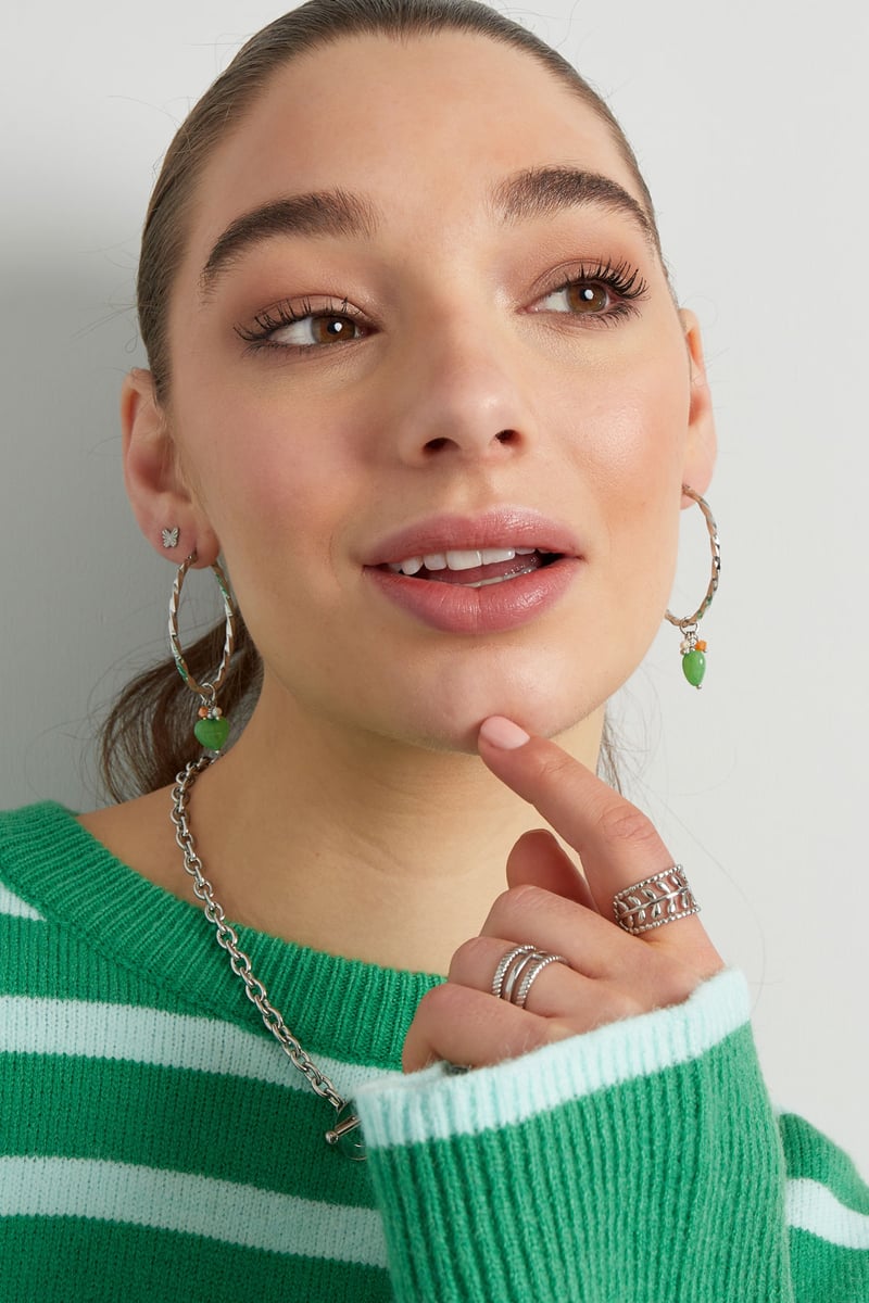 Ontdek de prachtige Oorbellen gedraaid met hart in zilver/groen. Deze trendy oorringen zijn perfect voor elke gelegenheid en voegen een... Lees meer