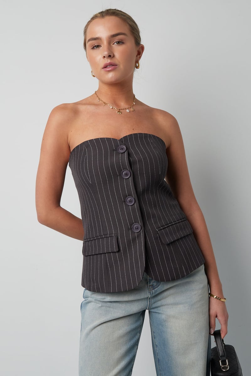 De Pinstripe Corset Top in grijs is een stijlvolle toevoeging aan je garderobe. Gemaakt van 95% polyester en 5% elastaan,... Lees meer